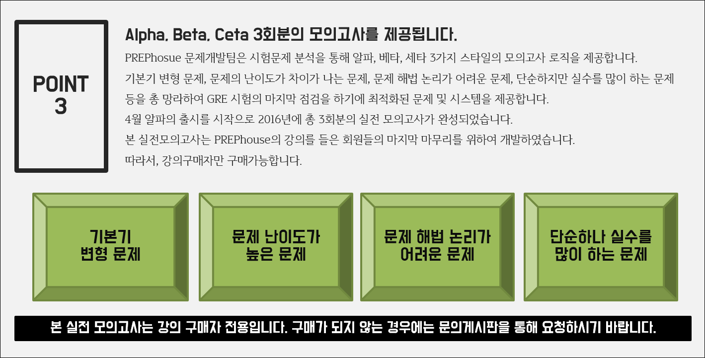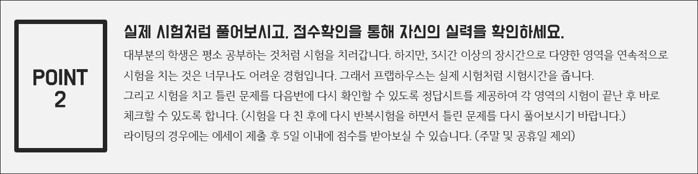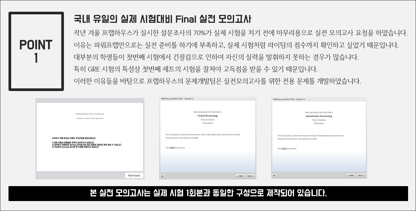 GRE 시험은 한번 시험을 치면 21일동안 시험을 칠 수 없습니다. 1년에는 5회이상 칠 수 없습니다. 따라서 시험을 치기 전에 많은 긴장으로 시험장에서 자신의 실력을 최대한 발휘하지 못하는 경우가 많습니다. 또한 자신이 시험치기 전에 충분한 준비를 하고 진행하는지를 알기에도 힘듭니다. 대부분의 GRE 시험을 준비하면서 파워프랩으로 준비를 하지만, 파워프랩은 시험보다는 공부용으로 더 많이 사용하고 있습니다. 따라서 PREPhouse에서는 실전 모의고사를 통하여, 실제 시험 전 마무리를 위한 작업과 시험환경에서 최대한의 자기 실력을 발휘할 수 있도록 준비하였습니다.