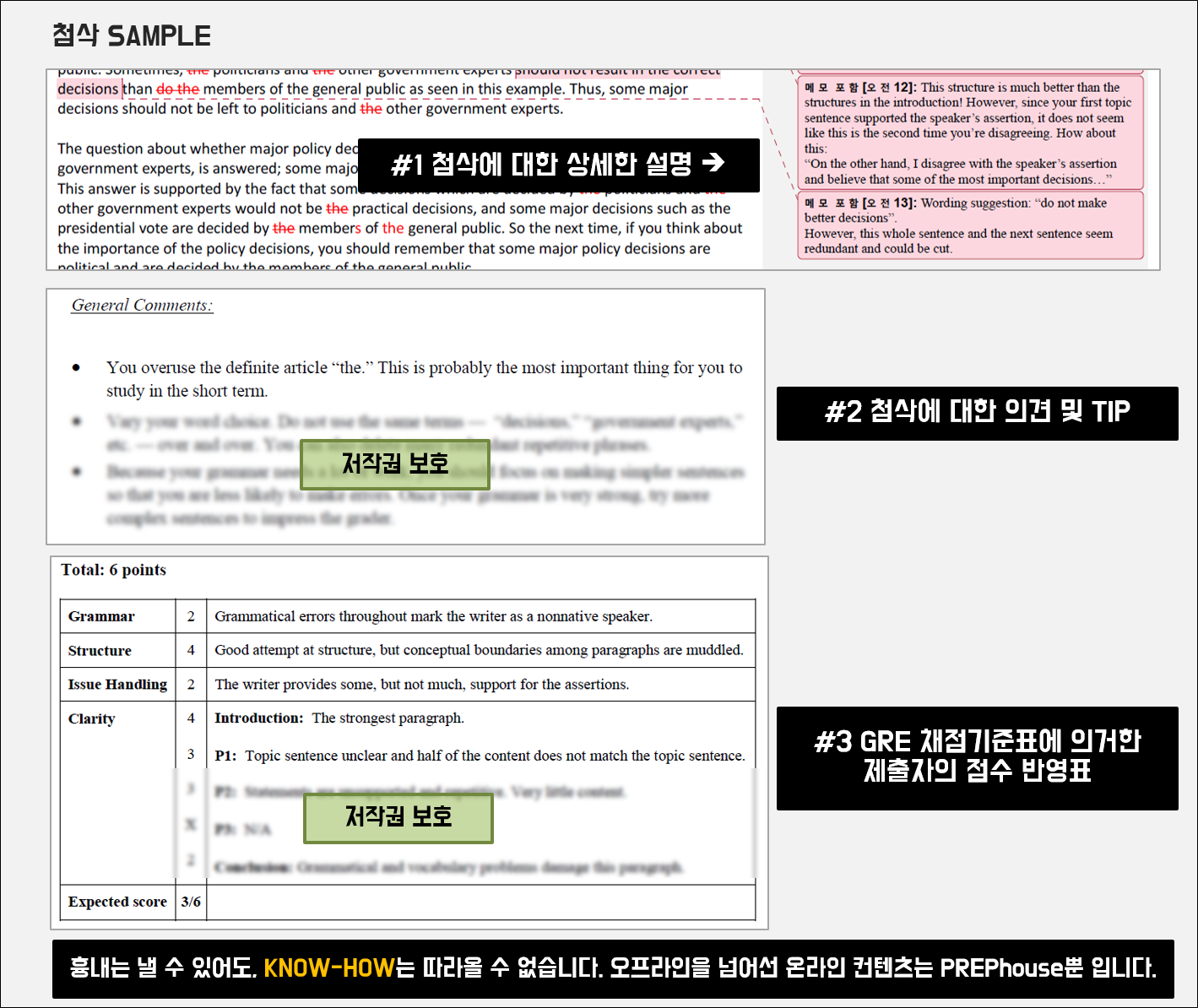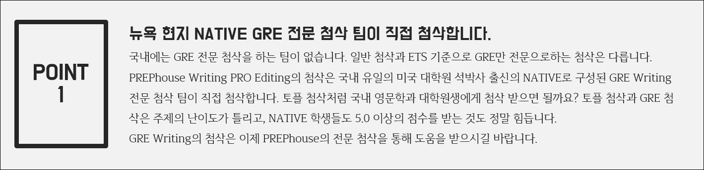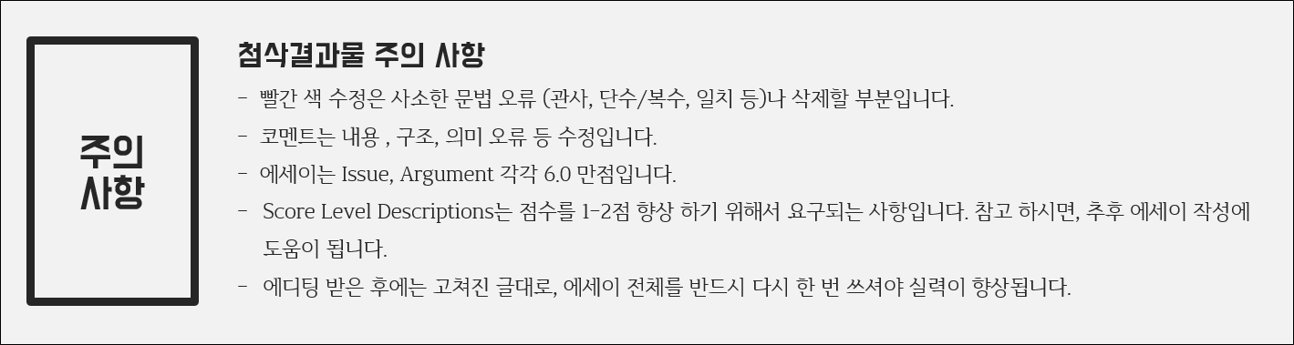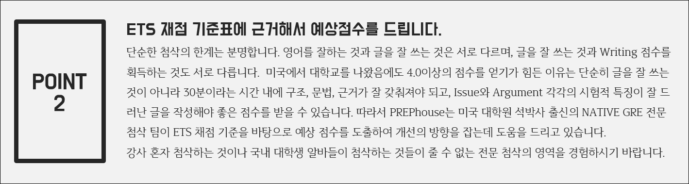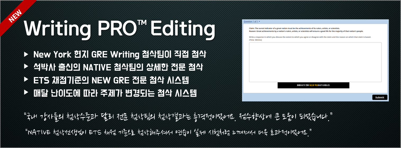 “3.5점 받는 것도 힘드네요…”, “글은 쓰겠는데, 막상 주제를 보면 생각이 잘 안나요..” 이 두 가지 반응이 Writing 공부를 할 때 자주 보는 피드백입니다. 당연합니다. 단순히 글을 쓰는 연습으로 진행하는 것은 진행속도가 상대적으로 느립니다. GRE Writing Essay 점수에는 브레인스토밍, 작문실력, 문법, 전체적인 구성 등 다양한 요소가 만족해야 됩니다. Writing PRO 동영상에서 점수를 따는 이론을 공부했다면, Editing을 통해 연습하셔서 체득하시길 바랍니다.