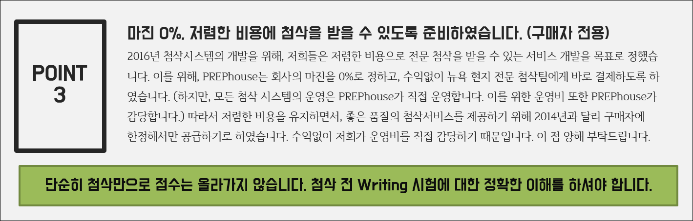 A: 아닙니다. 본 서비스는 PREPhouse의 구매를 하는 사람이라면 누구든지 서비스 받을 수 있습니다. 다만, 베타서비스 결과 Writing PRO 강의를 공부하고 진행한 학생들이 그렇지 않은 학생보다 빠르게 점수가 향상되었습니다. 아무래도 Writing 시험의 이론을 알고 진행하는 것과 모르고 진행하는 것에 대한 차이인 것 같습니다.