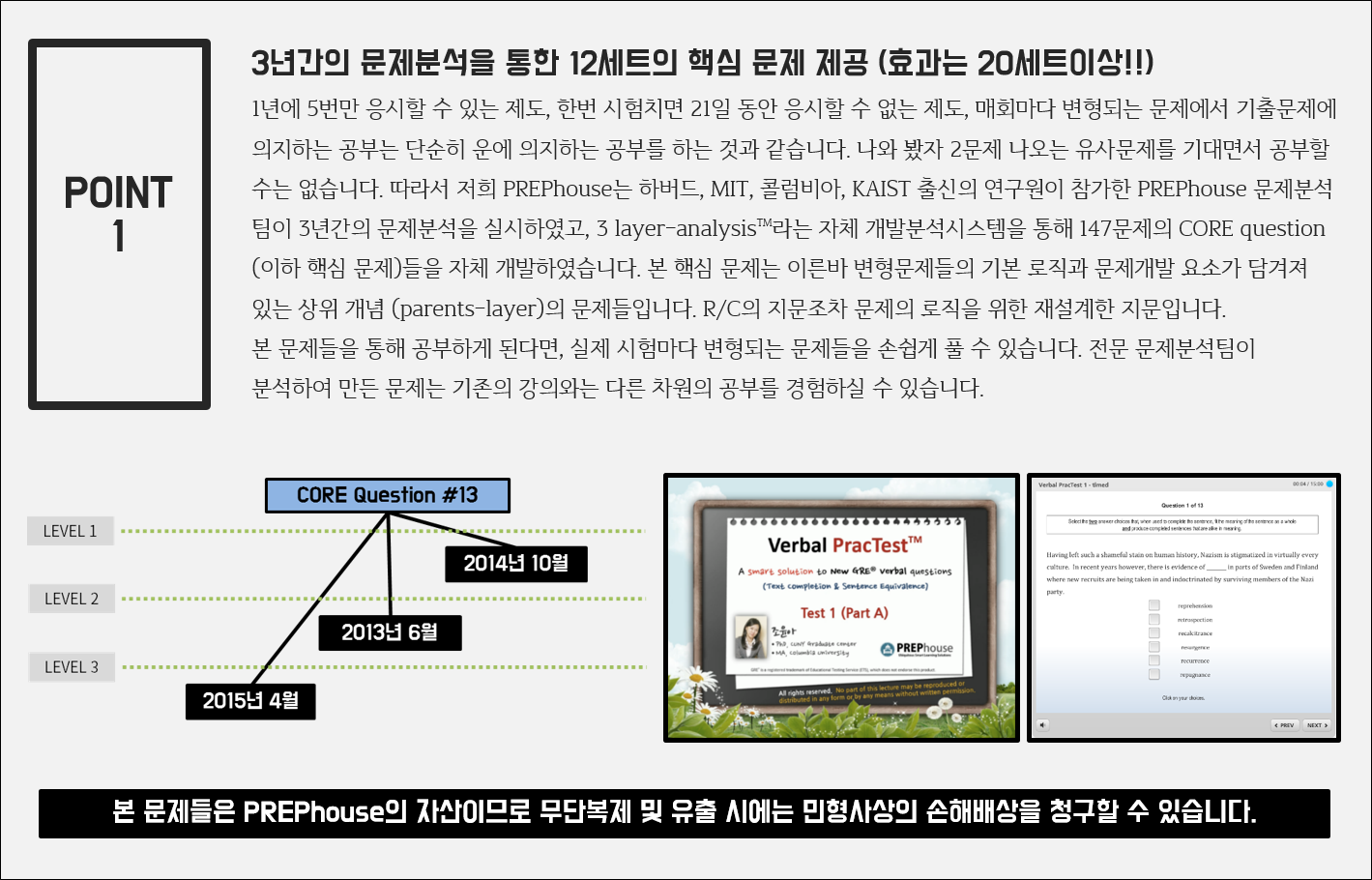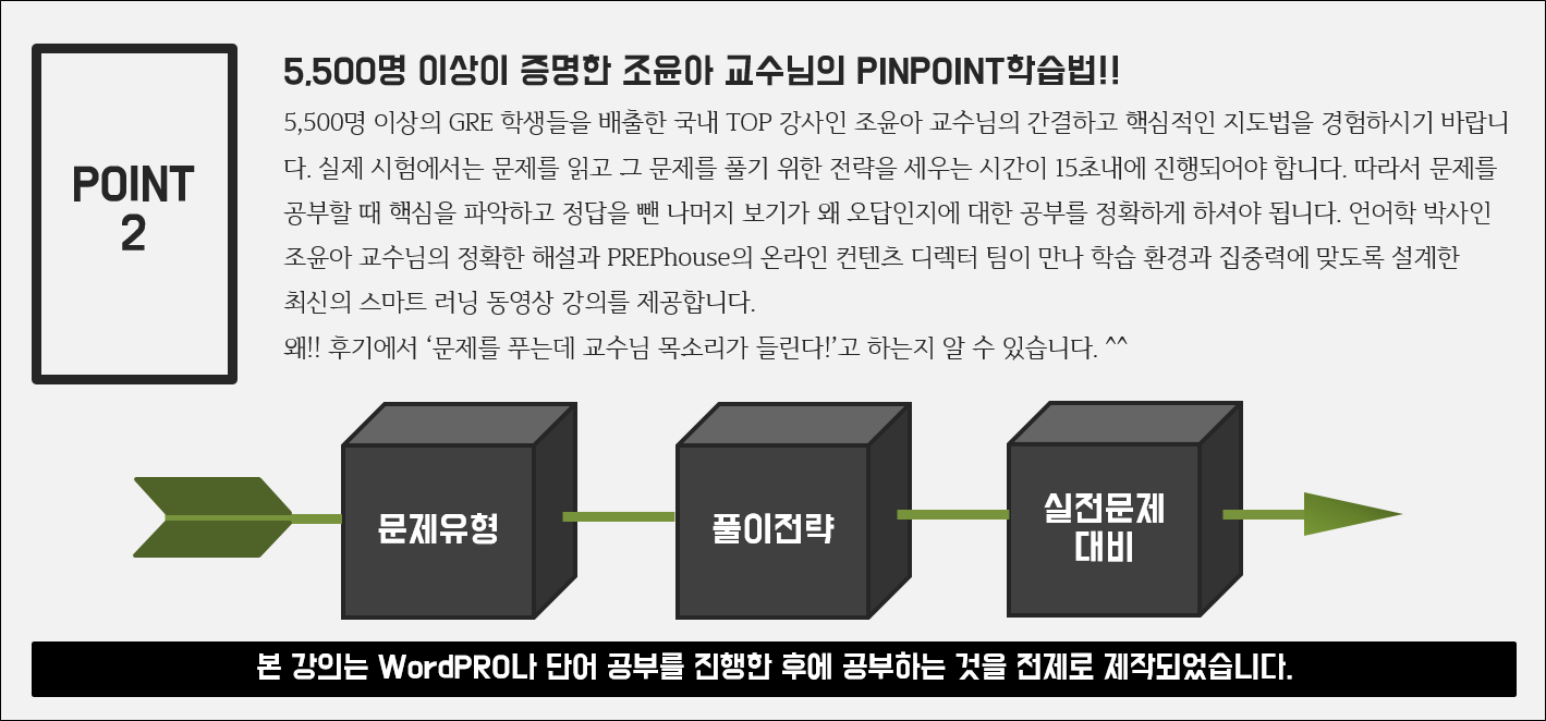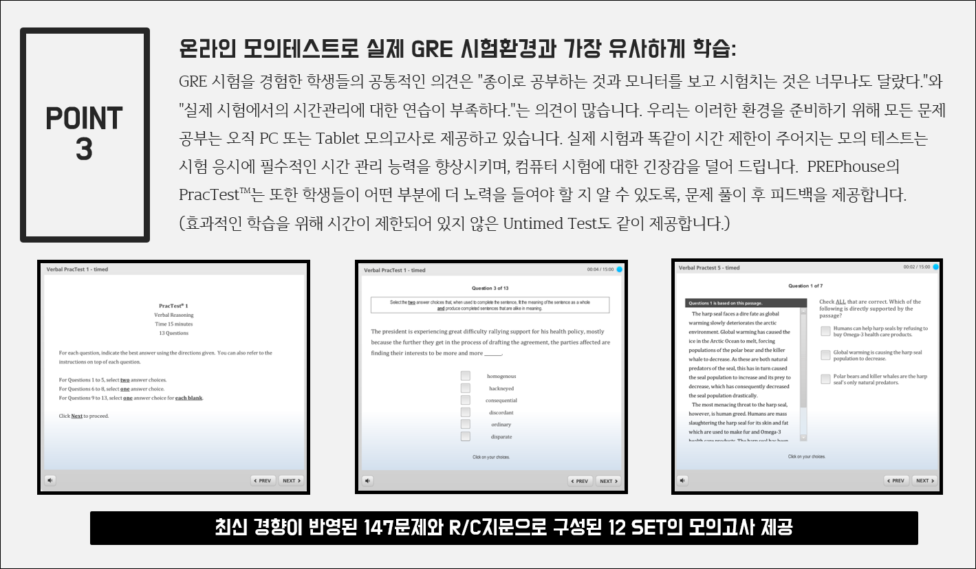 PREPhouse에서는 성적 향상을 보장하는, 온라인 강의 및 시험 준비 자료를 제공합니다. PREPhouse PracTest는 Verbal Section 전 영역, 즉 Text Completion, Sentence Equivalence, Reading Comprehension 문제에 어떻게 접근할 것인지를 설명을 하며, 빠르고 정확한 문제 풀이를 위한 전략 및 조언을 드립니다. PREPhouse의 Verbal PracTestTM를 이용하시기 전에, 엄선된 GRE 단어로 구성된 Word PROTM (영어 강의) 또는 Word PRO BasicTM (한국어 강의)을 수강하시면 훨씬 더 편하게 문제 풀이에 접근하실 수 있습니다. Word PRO BasicTM 에서 설명되는 단어는 500개 정도이며, Basic 수강 후에 영어 강의인 Word PROTM 수강하시면 훨씬 많은 양의 단어 (약 1,500개)를 단계적이고 효율적으로 학습하실 수 있습니다.