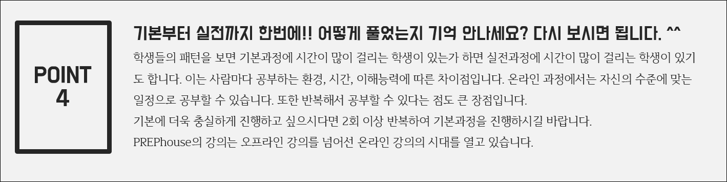 A: PREPhouse 공식까페의 'PREPhouse 질문게시판'에 글을 남기시면 선생님께서 답변해드립니다. (구매회원 전용)